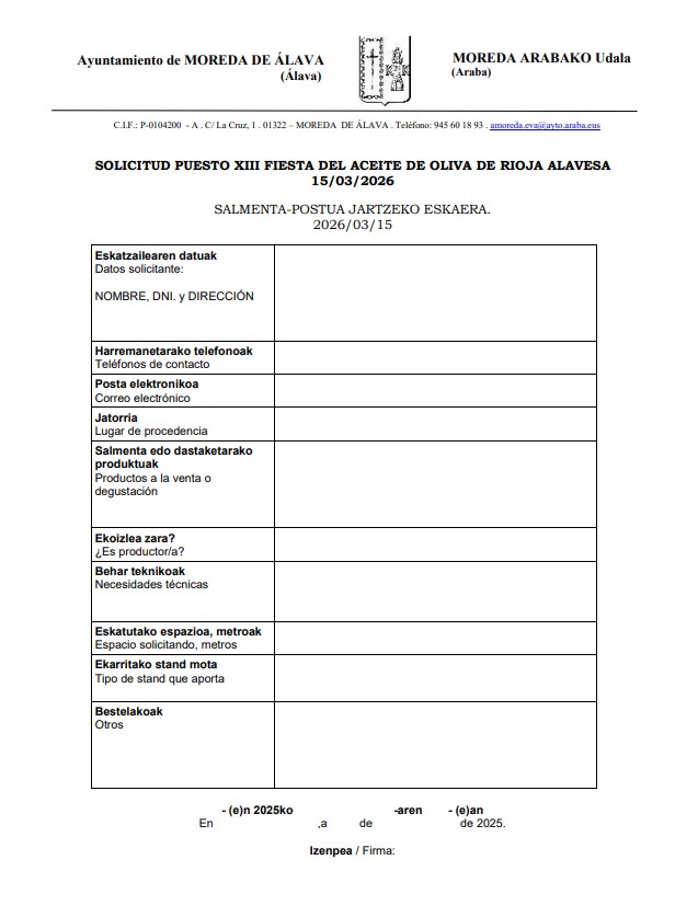 Impreso de solicitud de puesto para la Feria del Aceite de Oliva 2026 DESCARGA AQUI 2026-01-13 alkure Compartir ! tweet